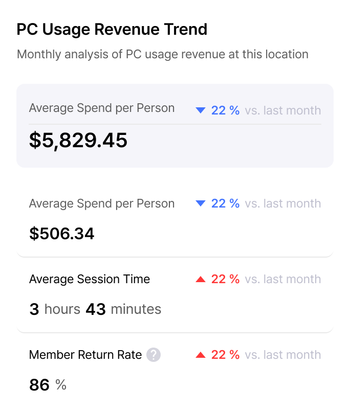 Track individual usage patterns, popular games, and visit frequency to make data-driven decisions